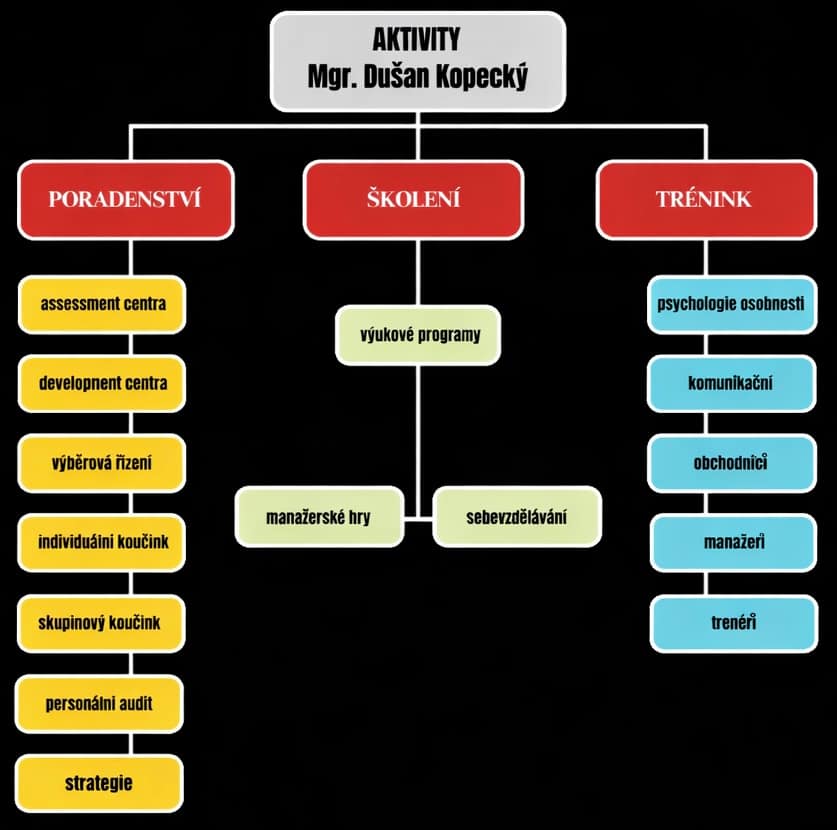 Realizuje výukové programy a kurzy, zaměřené na rozvoj obchodních, manažerských nebo komunikačních dovedností.
